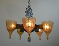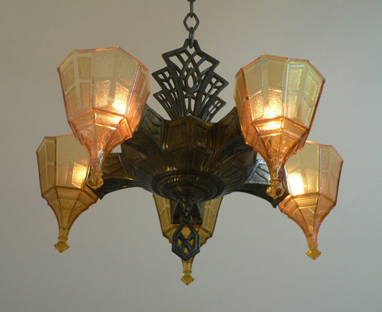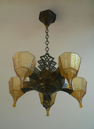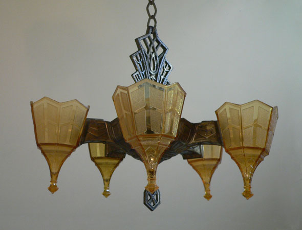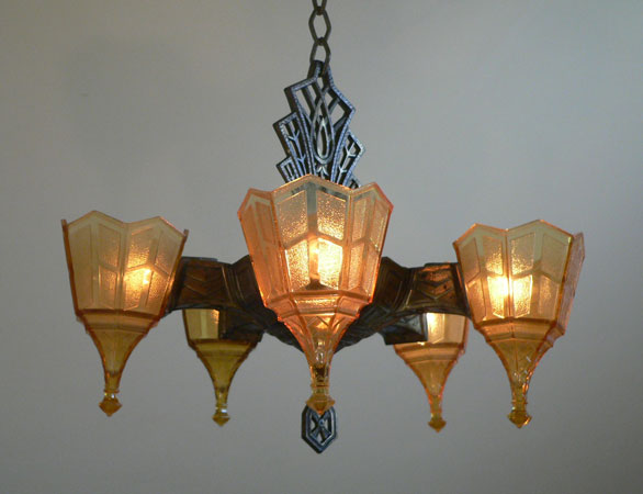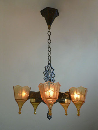 Chandelier C304This is a rare Art Deco chandelier by Frankelite. The five amber colored glass shades have beautiful elongated bases with a geometric pattern of clear and frosted areas. The pattern is repeated in both the body and harp of the bronze colored metal fixture. H: 30" (adjustable chain) |