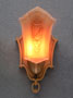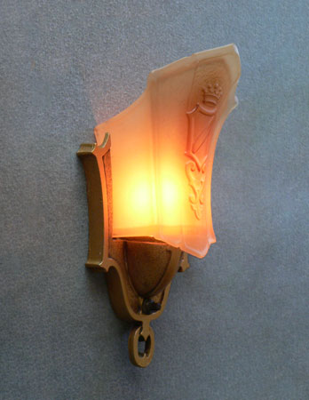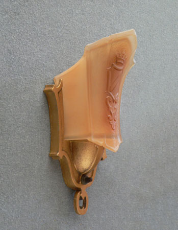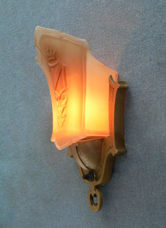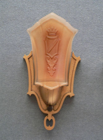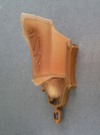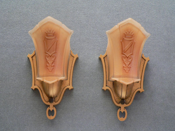 Sconce S225*Not Available* This pair of Art Deco sconces was made by Markel in the 1930s. The glass slip shades are a two toned dark cream color. They each have a heraldic sheild, topped by a crown in high relief. The back plates have a dark gold colored patina. H: 9.75" |