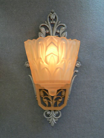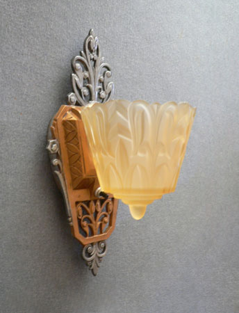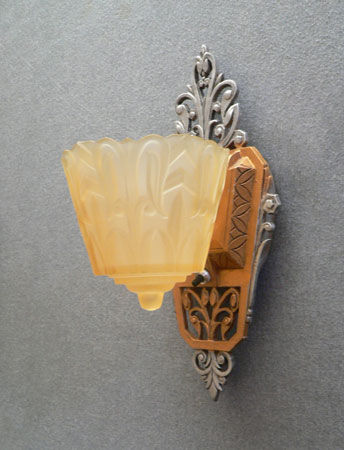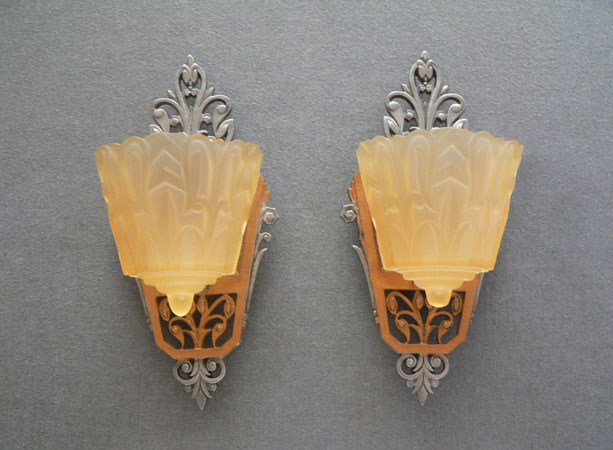 Sconce S226This beautiful pair of Art Deco sconces was made by Lincoln in the 1930s. The amber, glass slip shades have stylized designs, in deep relief, suggesting leafy vegitation. The back plates compliment the shade design with lovely floral elements. They have a dark gold colored patina, as well as polished silver metal. H: 12" |