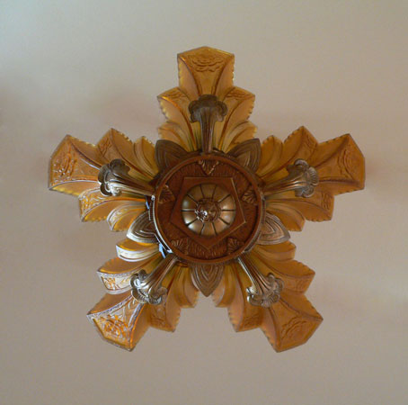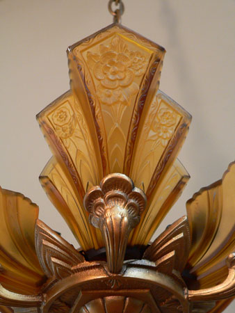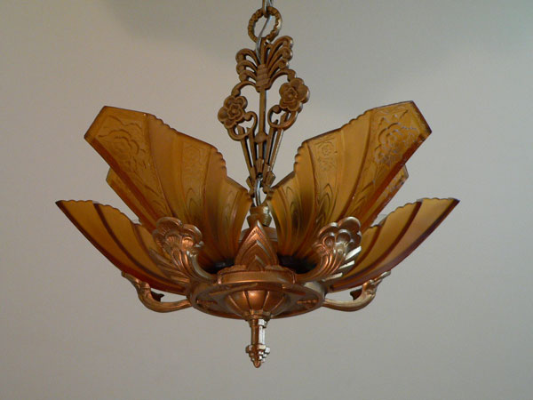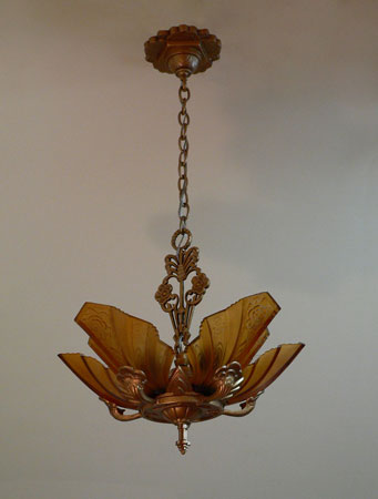 Chandelier C109This delicate and extremely rare Art Deco chandelier was made by Halcolite in the 1930s. It has five amber colored glass slip shades with beautifully sculpted roses, each in the shape of a fan. The unique fixture has plant-like appendages holding up the shades. The glass is in good condition. The fixture is iron, refurbished with a golden bronze patina. Scroll down to see all the pictures of this lovely chandelier. Click here to see similar chandelier with light amber shades (C-171) H: 31" (adjustible chain) |
