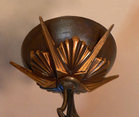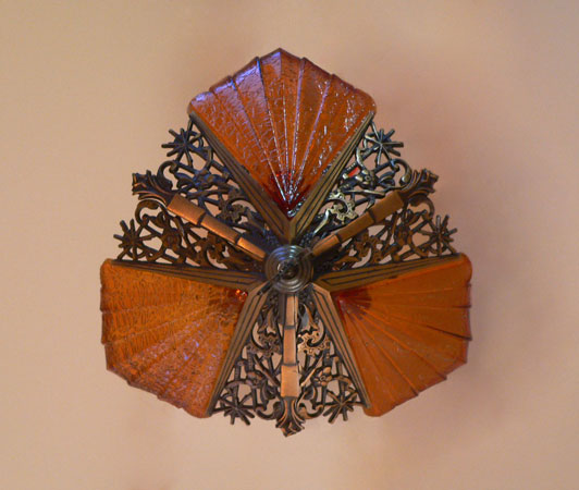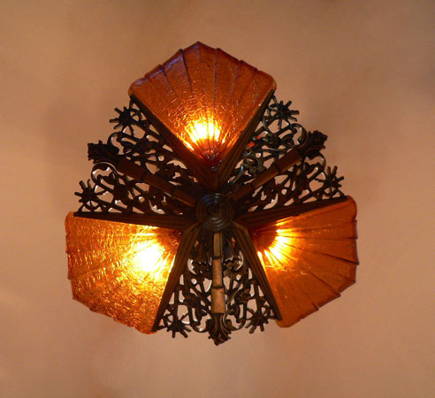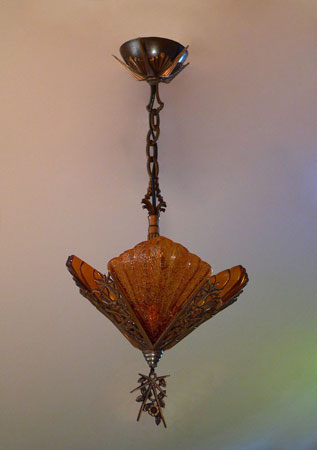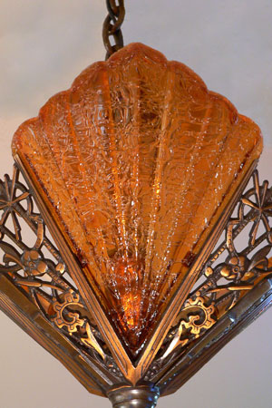 Chandelier C112*Not Available* This magnificent example of Art Deco was created by Cincinnati Artistic Brassworks. The three amber crackle glass slip shades are held in a delicate cast bronze fixture. The patina is in perfect condition. Be sure to scroll down for all the pcitures. H: 26" (adjustible chain) |