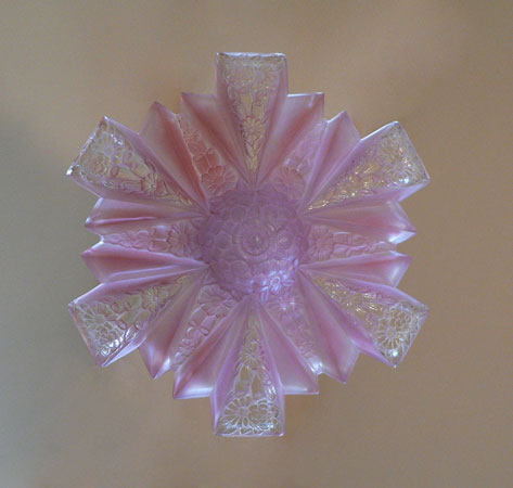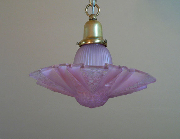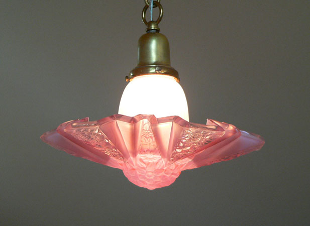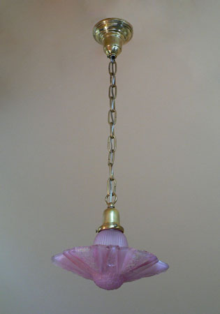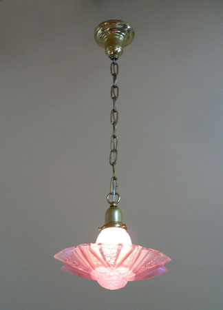 Chandelier C114*Not Available* This dainty Art Deco chandelier was made by Lightolier. The beautiful pink glass shade has a delicate floral motif. In this design, the main shade fits into a fluted glass bell that holds the bulb. H: 31" (adjustible chain) |
