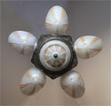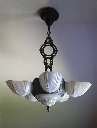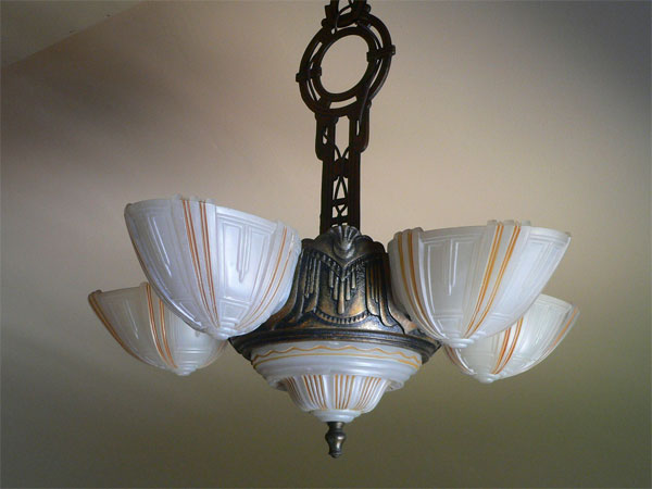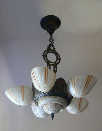 Chandelier C12*Not Available* This is a five slip shade Art Deco chandelier by the Virden Company. The shades are off white with orange accents. There is also a matching glass shade at the bottom of the fixture. The metal is cast iron with the original patina. H: 26" (adjustable chain) |