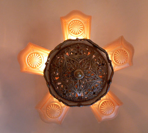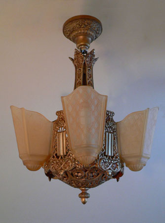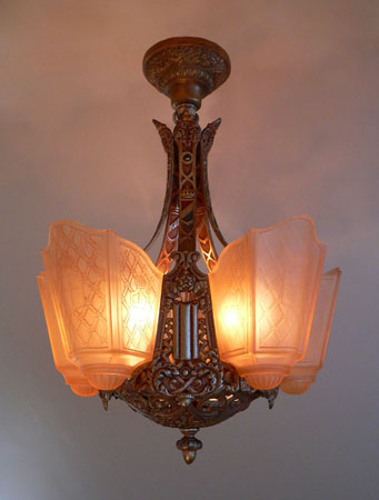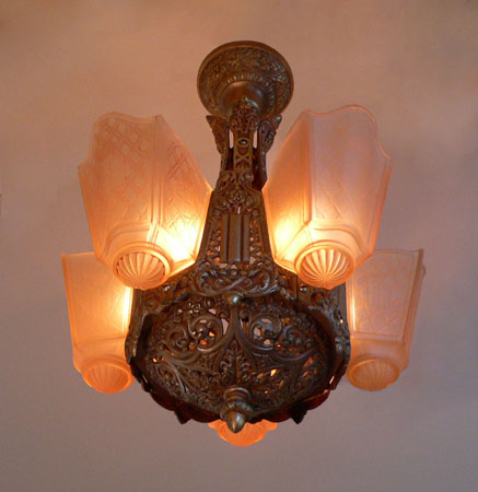 Chandelier C120*SOLD* This Art Deco Chandelier by the Moe Bridges Co. has five regal, amber glass, slip shades, decorated with coats of arms. The cast iron fixture is decorated with delicately carved oak leaves and acorns. The golden colored patina is in good condition. H: 22" (flush mount) |