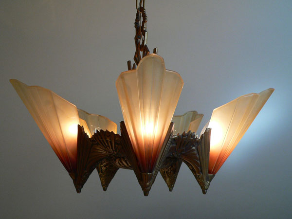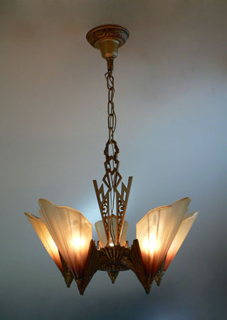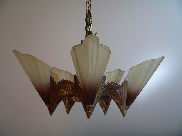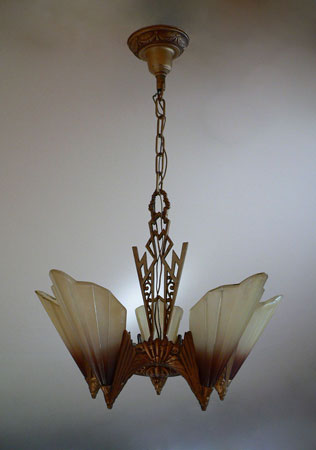 This is a beautiful model from the Art Deco Soleure Series by Midwest Manufacturing. Five brown tip slip shades surround the ornate metal fixture. The glass shades are in perfect condition. The cast aluminum metal work has its original antique gold colored patina in outstanding condition.