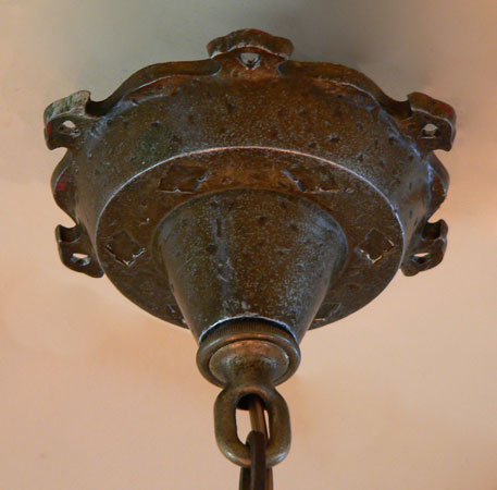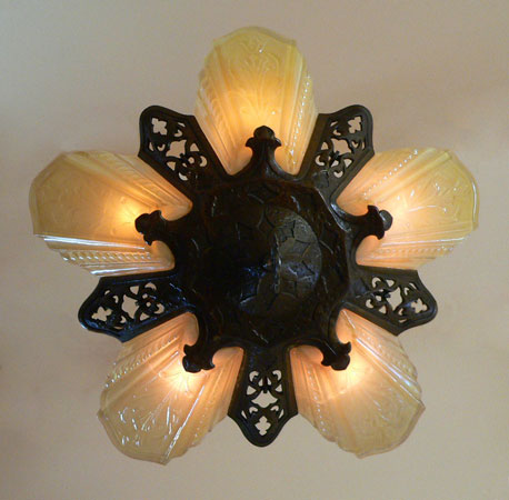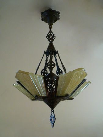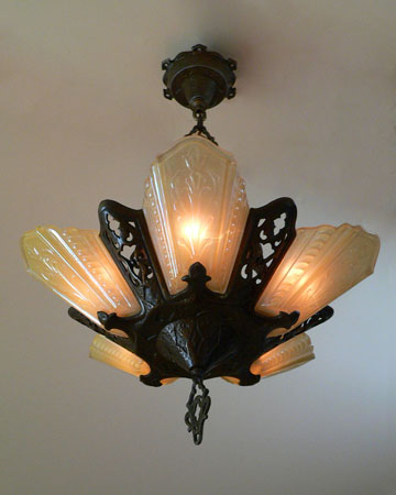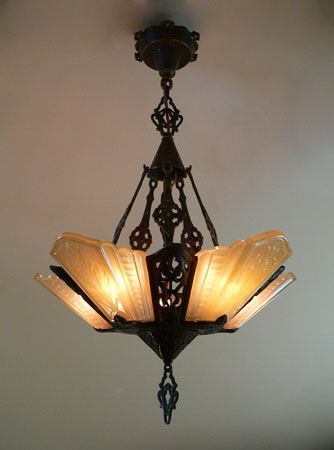 Chandelier C122*SOLD* This Art Deco chandelier by Virden has five glossy, amber glass slip shades with lovely raised designs that are mirrored in the metal work. The fixture is cast iron with its original bronze colored patina. Both the glass and patina are in excellent condition. H: 28" (adjustable chain) |