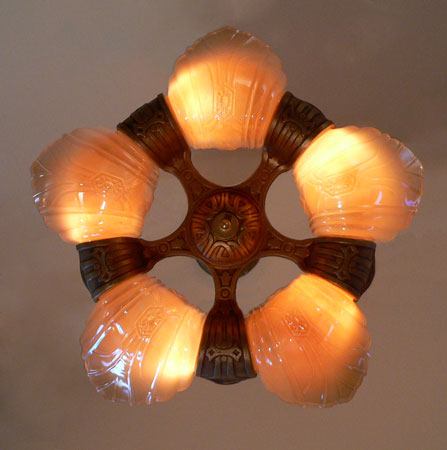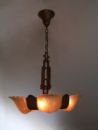 Chandelier C125*Not Available* This Art Deco design by the Markel Co. has five, high gloss, amber colored glass slip shades that create a ring of light around the central spokes of the fixture. The metal has a bronze colored patina in very good condition. H: " (adjustable chain) |
