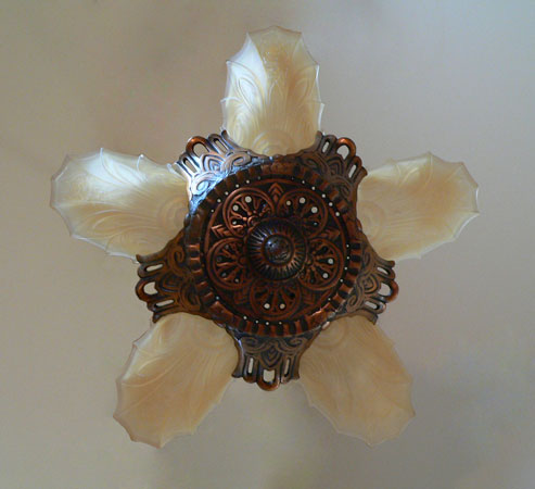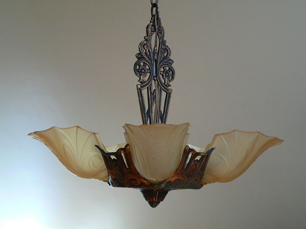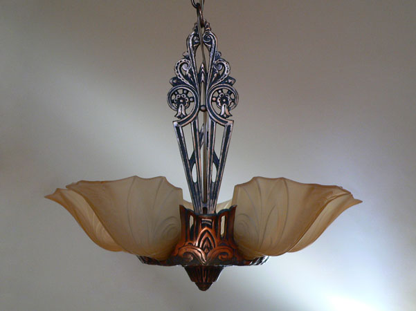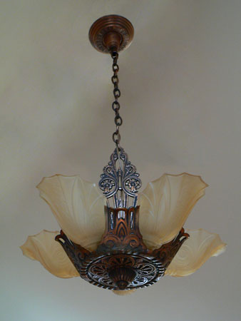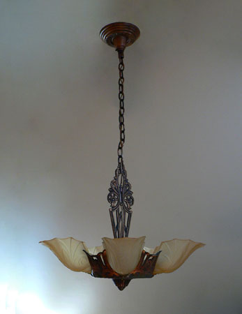 Chandelier C126This charming Art Deco design has five lovely amber glass shades with a delicately fluted design. Floral motifs adorn both glass and metal. The iron fixture has a bronze colored patina. Both the glass and patina are in very good condition. H: 31" (adjustable chain) |