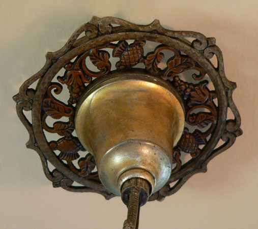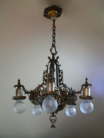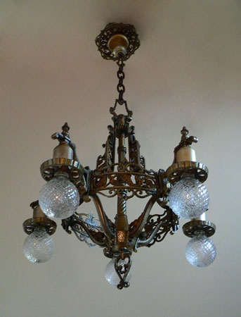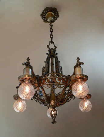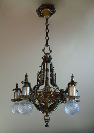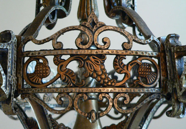 Chandelier C132*Not Available* This is a large chandelier by the Lincoln Co. from the 1900's. The ornate fixture is cast bronze with a polychrome patina in pewter and gold that is in good condition. Decorative flourishes in the metal work have a beautiful grape vine and thistle motif covering it from top to bottom. In heraldic tradition, grapes signify peace and felicity, while the thistle is an Old Scottish symbol of nobility. See the matching sconces H: 35" (adjustable chain) |