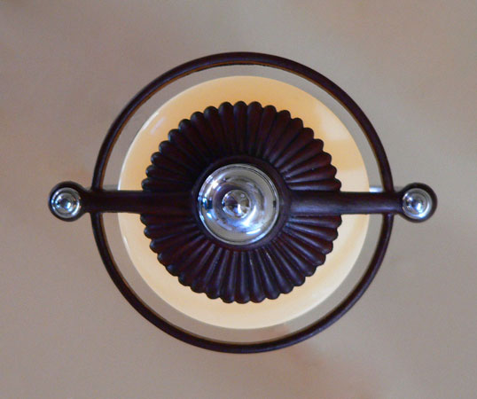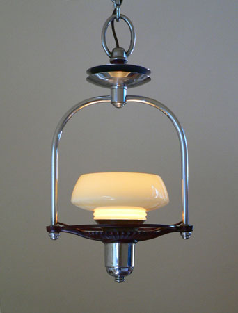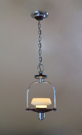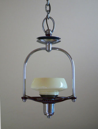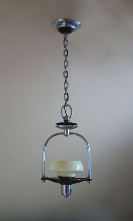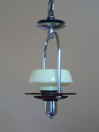Chandelier C134*SOLD* This is a cute little pendant Art Deco chandelier with a machine age feel. The custard glass shade sits above a scalloped maroon plate and ring (see the view from below) The rest of the fixture is in chrome. Both the glass and fixture are in good condition. H: 29" (adjustable chain) |