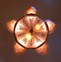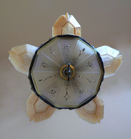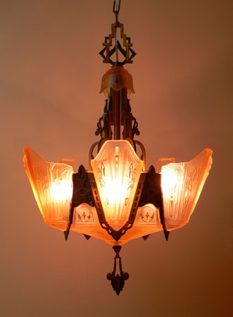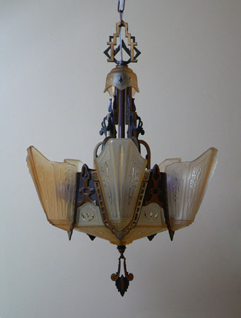 Chandelier C135This beautiful Art Deco chandelier by Markel has five, delicate, light amber glass slip shades embossed with geometric floral designs. The five shades suround a very large central shade at the base. In this design, the glass of the base actually reaches up on the sides of the fixture. All the glass is in very good condition. The metal fixture is bronze with the original patina, in excellent condition. H: " (adjustable chain) |