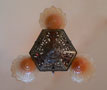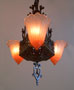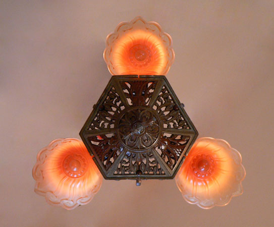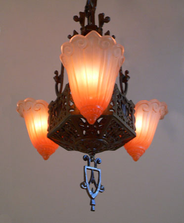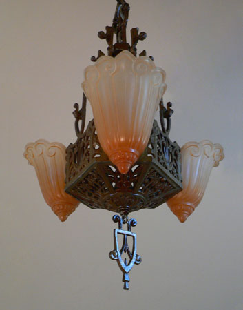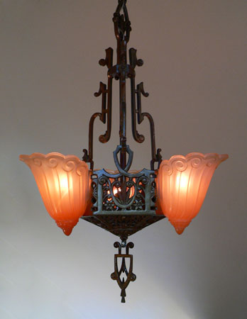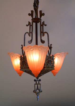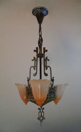 Chandelier C140This is a lovely Art Deco chandelier in the "fleur de lis" line by Lincoln. The three slip shades are amber colored glass with the intensity of the color increasing toward the bottom of each shade. The ornate aluminum fixture has a clear bronze colored wash. The glass shades and original patina are in excellent condition. H: 33"(adjustable chain) |