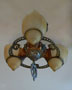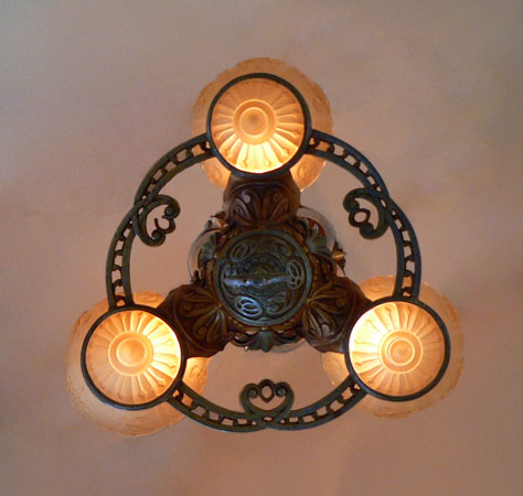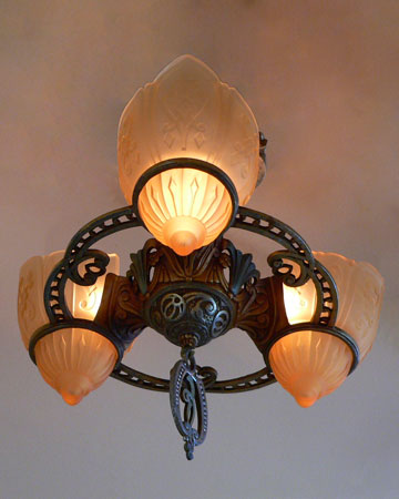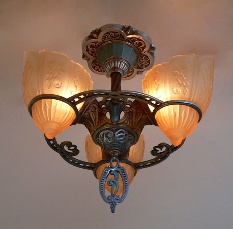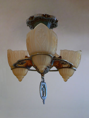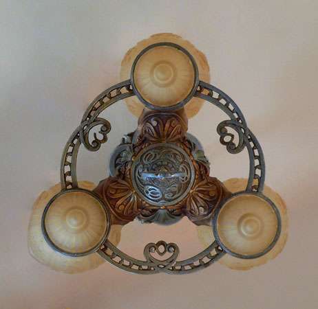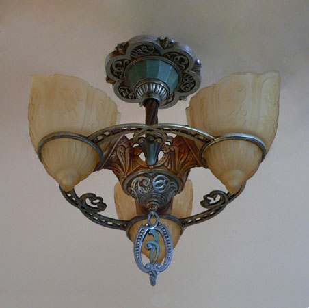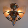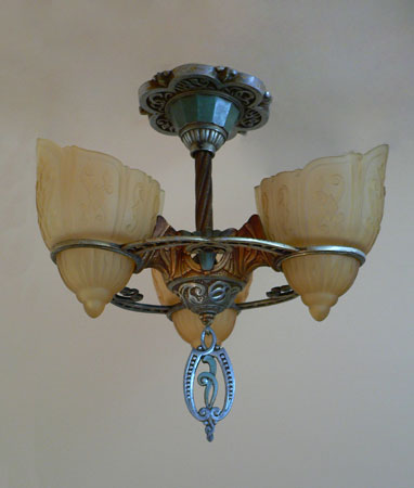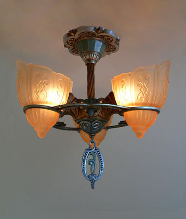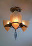 Chandelier C143*Not Available* This is a charming Art Deco flush mount chandelier by Markel. The three beautiful amber shades are suspended around the wonderfully sculpted fixture by rings. The metal has a polychrome patina with silver, gold and sea green. Both the fixture and glass are in very good condition. H: 16"(flush mount) |