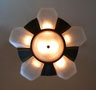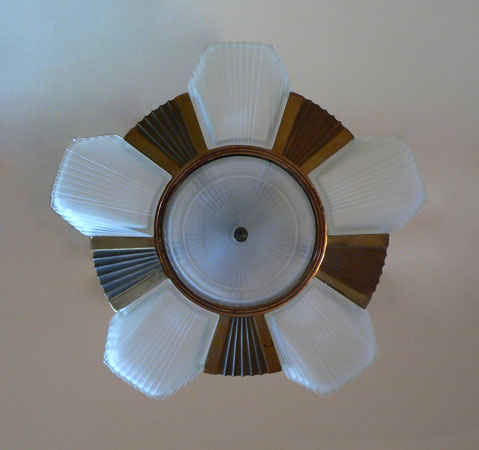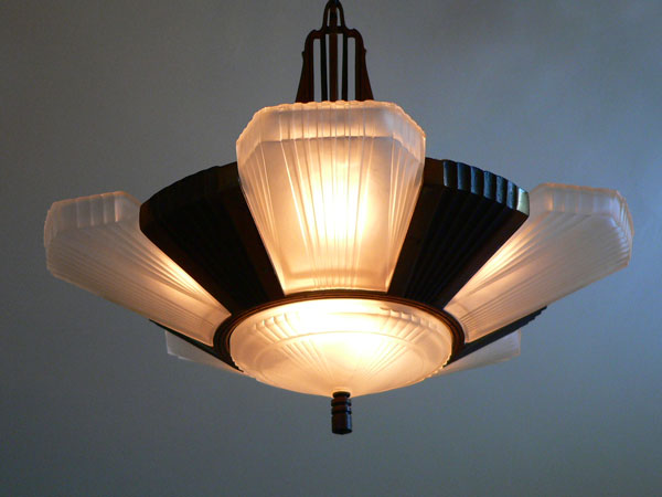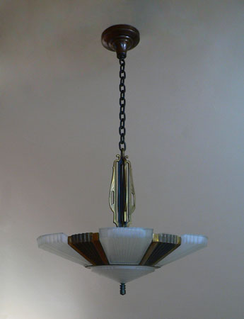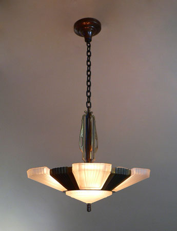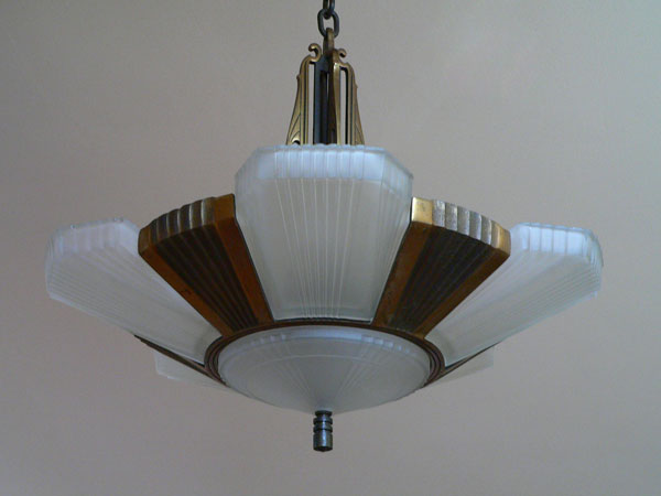 Chandelier C145*Not Available* This is a classic Art Deco chandelier in the modernist style from the 1930s . Five frosted white shades surround a matching central disk. The fanned ridges in the glass are repeated in the metal. The fixture is bronze with the original patina in very good condition. H: 33"(adjustable chain) |