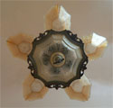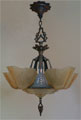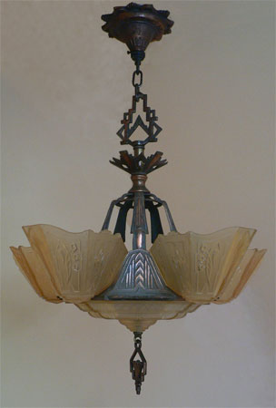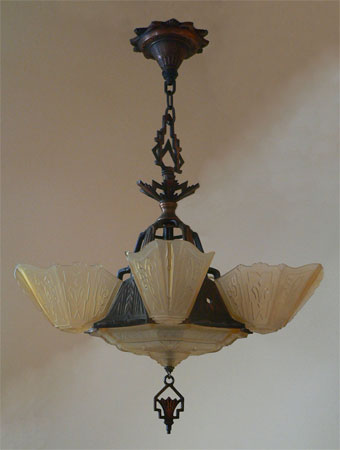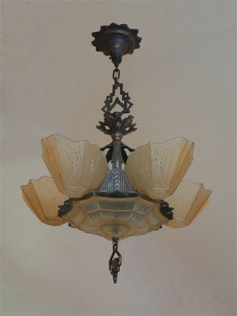 Chandelier C15This Art Deco chandelier by the Markel Co. has five amber glass slip shades as well as a large matching glass shade on the bottom of the fixture. The glass has geometric designs that match the cast iron metal work. The patina is original and in perfect condition. H: 30" (adjustable chain) |