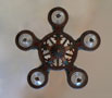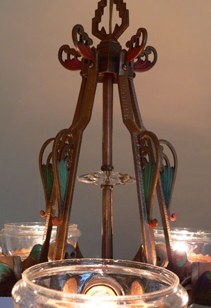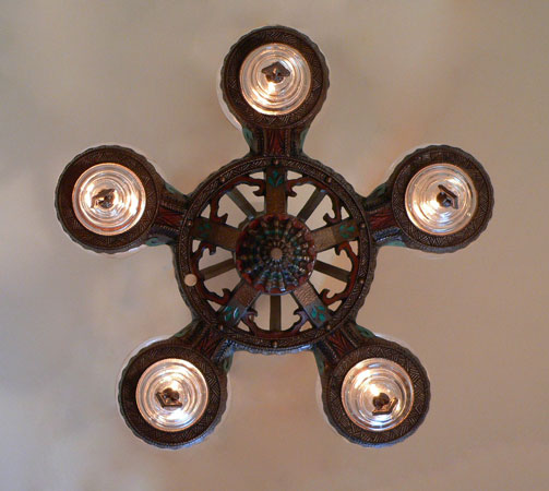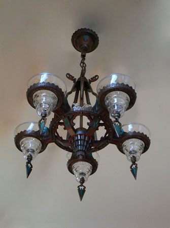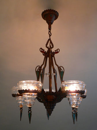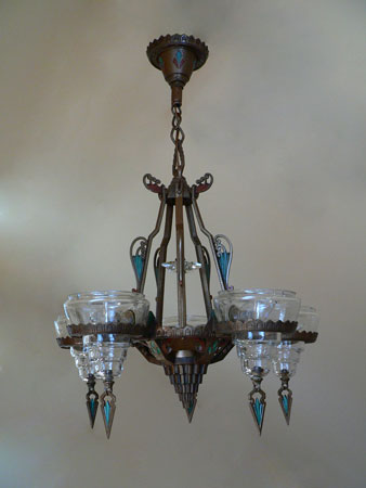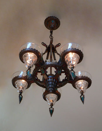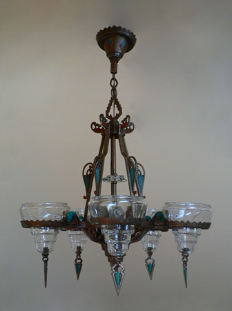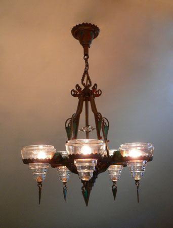 Chandelier C150This Art Deco chandelier was made by the Gill Glass Company, and is from their "Modernique" line. Five original, clear glass shades are suspened by decorative rings. Each shade has a decorative finial at the bottom. There is also a clear glass star on the center bar. The refurbished polychrome fixture is bronze colored with brick red and teal accents, duplicating the original design. (Please refer to the last photo for the most accurate depiction of the colors) Both the fixture and glass are in very good condition. H: 30"(adjustable chain) |