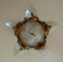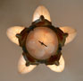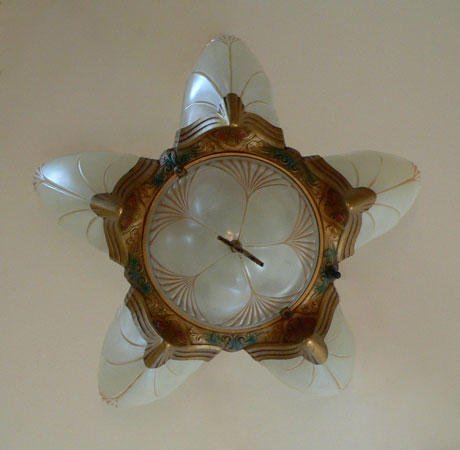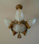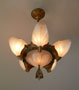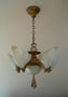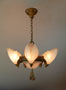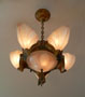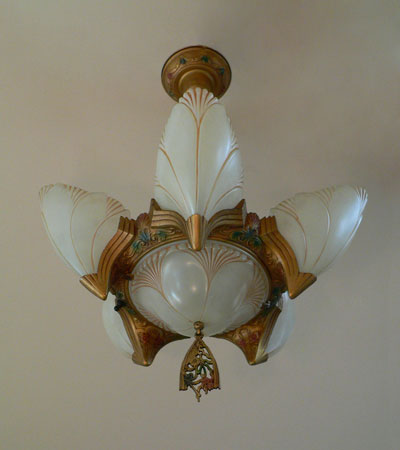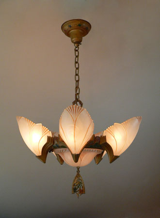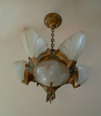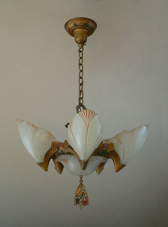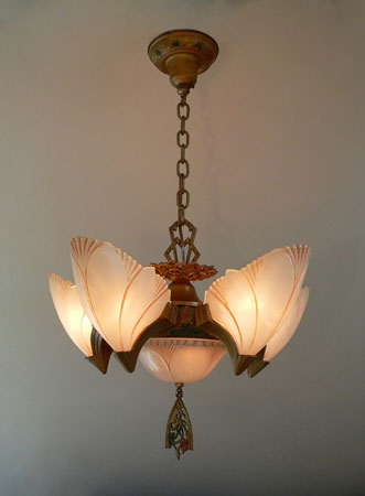 Chandelier C151*Not Available* This beautiful Art Deco chandelier by the Markel Co. has five cream colored, "batwing" slip shades with orange-brown accents. A sixth matching shade lights the bottom. The cast metal fixture has its original polychrome patina in excellent condition. This beautiful chandelier is rewired and ready for installation. H: 29"(adjustable chain) |