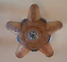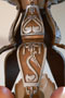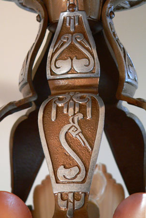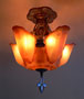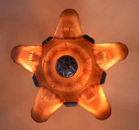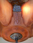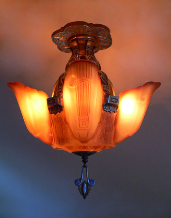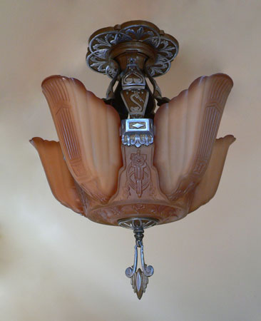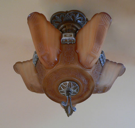 Chandelier C153*Not Available* This Art Deco chandelier by Markel has five, finely sculpted, dark cream colored slip shades with brown accents. The slip shades fit into a larger, matching glass portion of the fixture. The fixture has high polished aluminum decorations with a deep gold background. There are interesting bird forms in the metal. The patina is refurbished to the original finish. H: 20"(flush mount) |