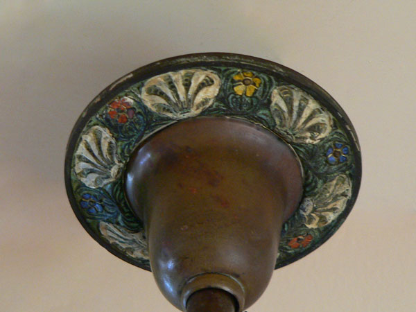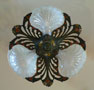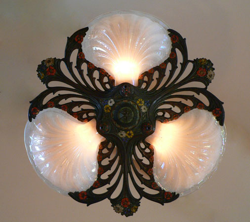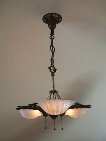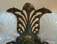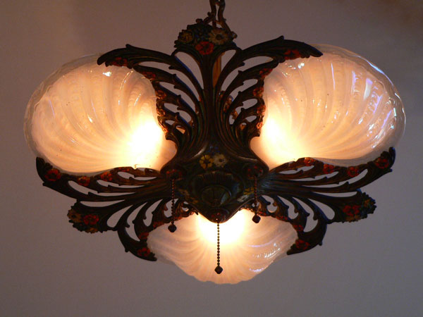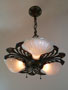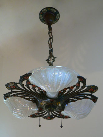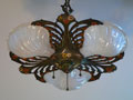 Chandelier C156This beautiful Art Nouveau/Art Deco chandelier has three irridescent slipshades, each in the shape of a delicate shell. The intricately worked metal is formed into sinuous stalks and flowers. The polychrome patina includes red, yellow, white, blue and green. The fixture is cast bronze with its original patina. Both the glass and patina are in excellent condition. Click here to enjoy the amazing 7 light version (C-103) and here to see the sconces (S-103) H: 26"(adjustable chain) |