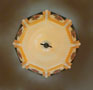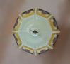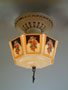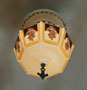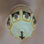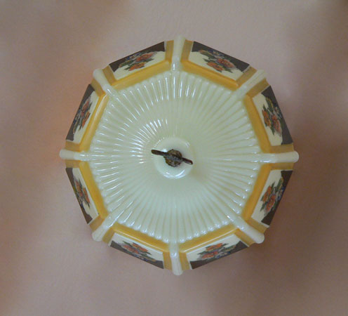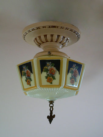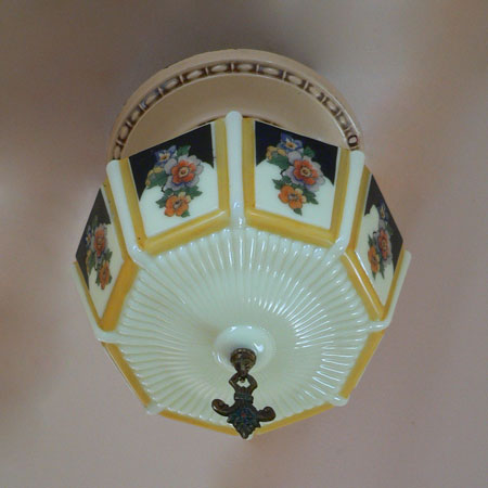 Chandelier C161*Not Available* This beautiful Art Deco flush mount Chandelier was made by Gill Glass in the 1920's. The octagonal glass shade is cream colored with a colorful floral pattern with some black background. The metal fixture is painted with a cream color. Both the glass shade and fixture are in good condition. H: 12"(flush mount) |