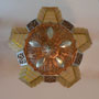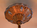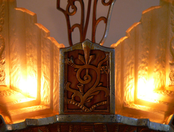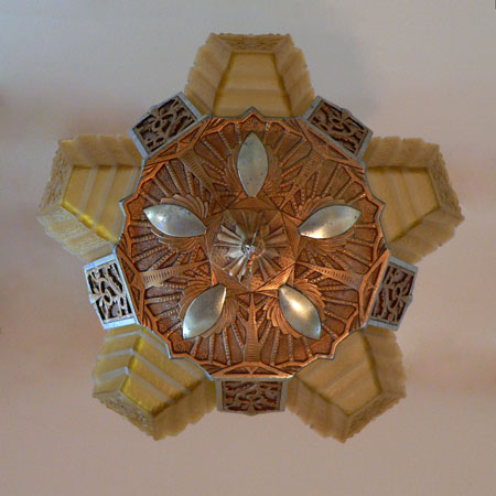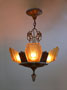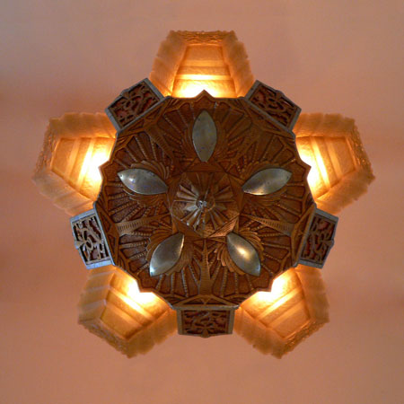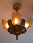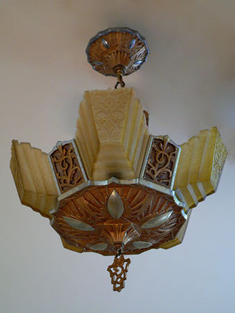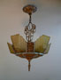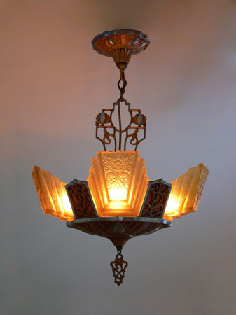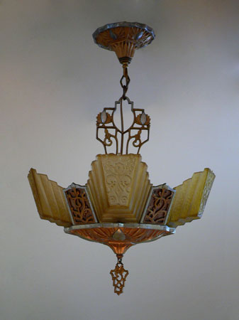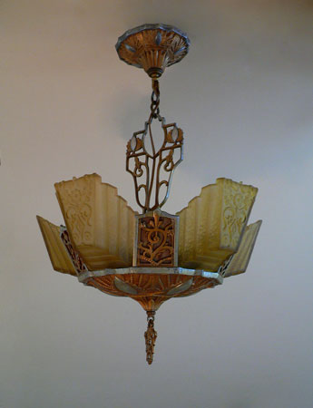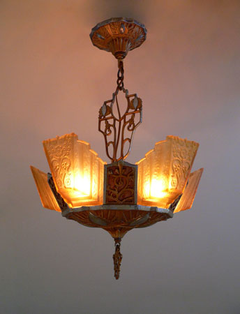 Chandelier C166*Not Available* This lovely Art Deco chandelier was made by Markel. The five amber glass slip shades have a "stepped" form with floral designs on the outer most side. The aluminum fixture is beautifully sculpted and has areas of both gold colored patina and polished metal surfaces. H: 24"(adjustable chain) |