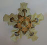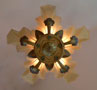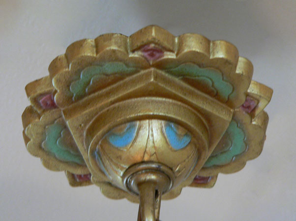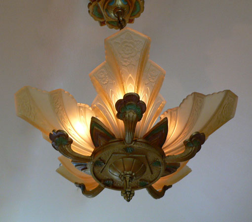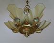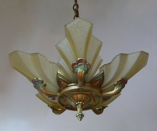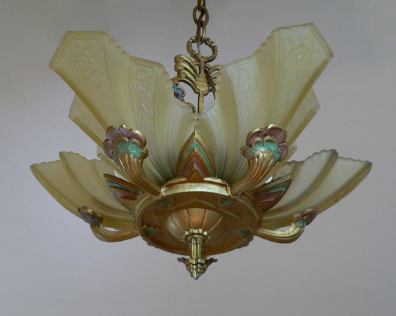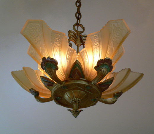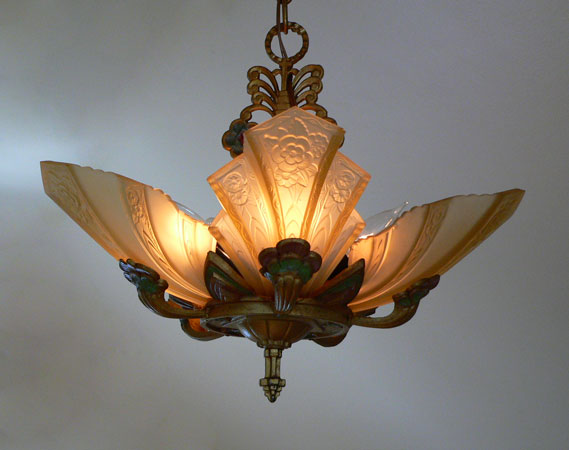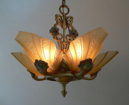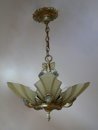 Chandelier C171*Not Available* This delicate and extremely rare Art Deco chandelier was made by Halcolite in the 1930s. It has five light amber glass slip shades with beautifully sculpted roses, each in the shape of a fan. The unique fixture has plant-like appendages holding up the shades. The glass is in good condition. The fixture is iron with the original golden colored patina with light blue, green and pink accents. Scroll down to see all the pictures of this lovely chandelier. Click here to see matching sconces (S-165) H: 24"(adjustable chain) |