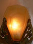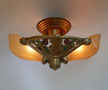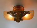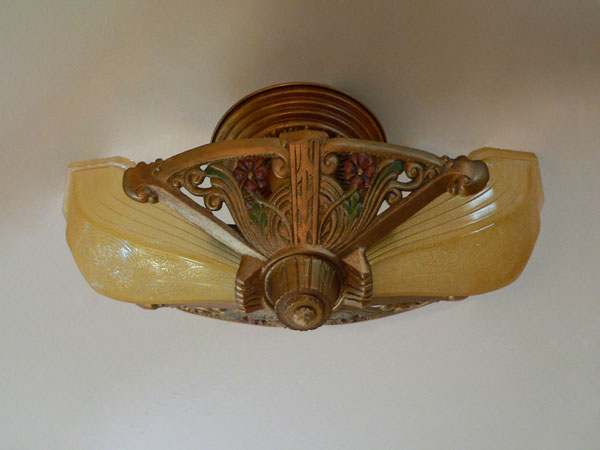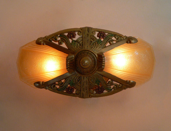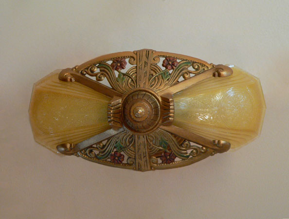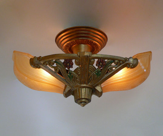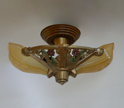 Chandelier C173*Not Available* This authentic Art Deco chandelier was made by Markel. It has two amber glass slip shades. The metal fixture has stylized floral forms with a polychrome patina in dark gold, red and green. H: 8"(fixed mount) |
