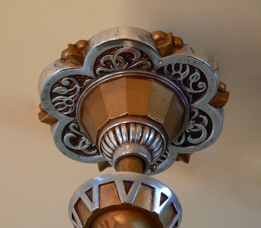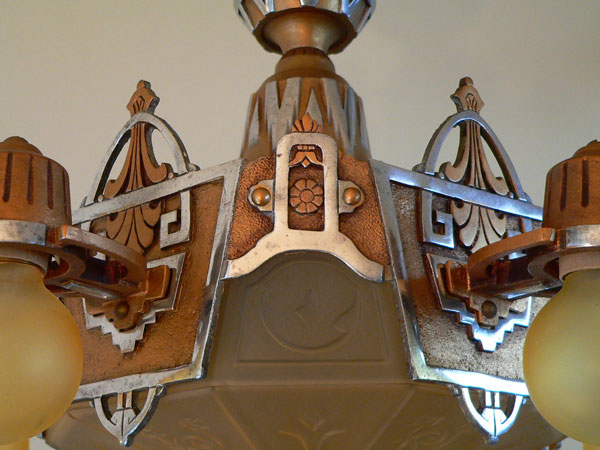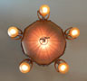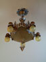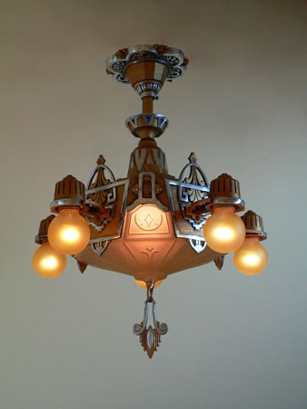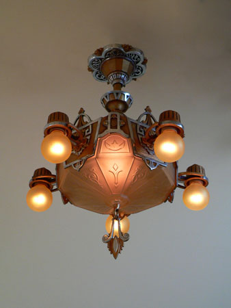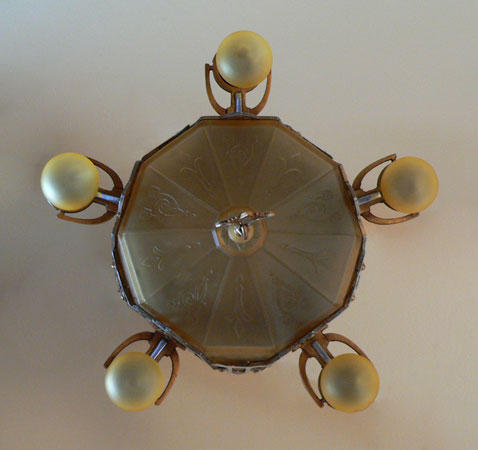 Chandelier C175*Not Available* This beautiful Art Deco chandelier was made by Markel in the 1930s. It has five bulb sockets surrounding a large central amber glass shade. It appears to be a transitional piece to the full slip shade model C-135 H: 21"(fixed mount) |