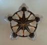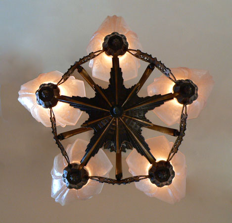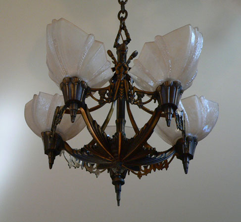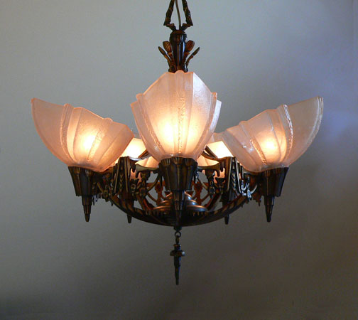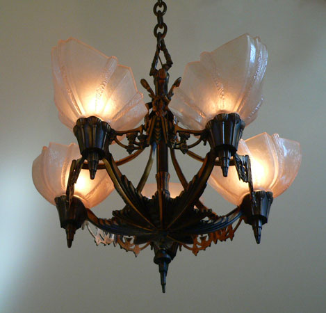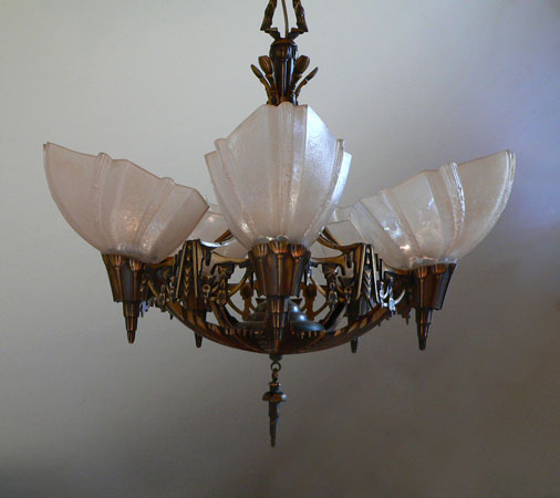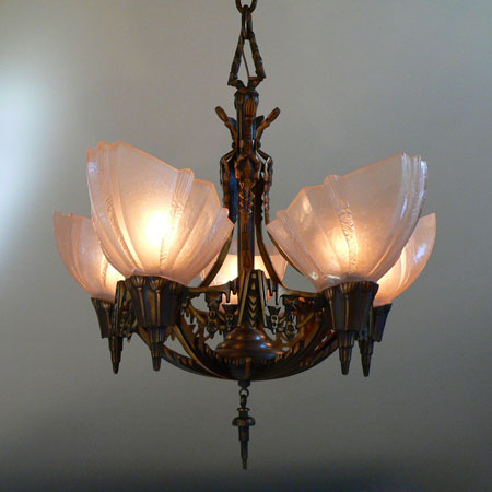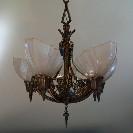 Chandelier C176*Not Available* This beautiful Art Deco chandelier was made by Midwest Manufacturing in the 1930s. The five delicately fluted shades are in champagne colored glass, held in the elegantly sculpted bronze fixture. Both the glass shades and the metal fixture are in excellent condition. See the matching three light chandelier (C-69) here and the matching sconces H: 35"(adjustable chain) |