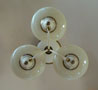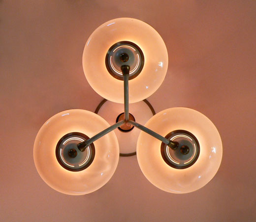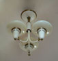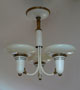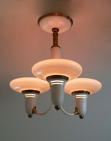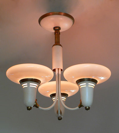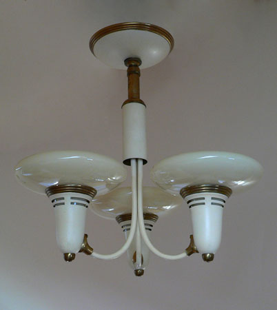 Chandelier C180*Not Available* This Art Deco chandelier from the 1930s was made by Lightolier. Three saucer shaped shades are made of custard glass. The brass fixture has large areas with a cream colored patina that compliments the shades very well. Both the glass and metal fixture are in very good condition. H: 15"(fixed mount) |