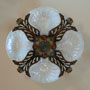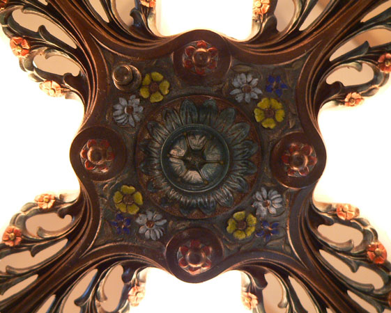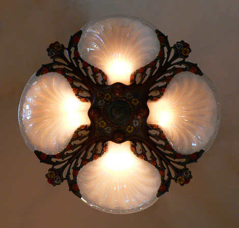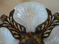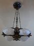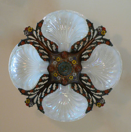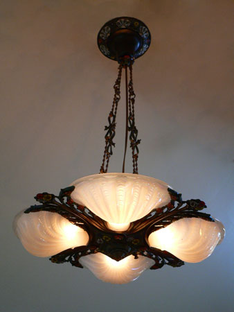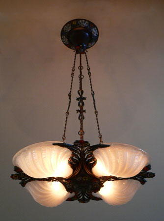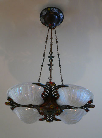 Chandelier C184This elegant and rare Art Deco chandelier has four irridescent slipshades, each in the shape of a delicate shell. The intricately worked metal is formed into sinuous stalks and flowers, suspended by twisted chain with four sculpted bow ornaments. The polychrome patina includes green, red, yellow, white and blue. The fixture is cast bronze refurbished to match its original patina. Both the glass and fixture are in excellent condition. H: 28" |