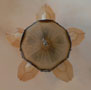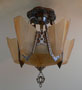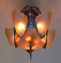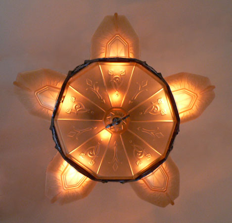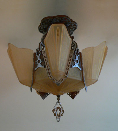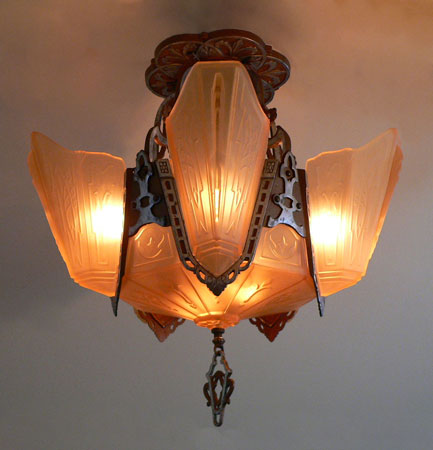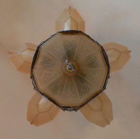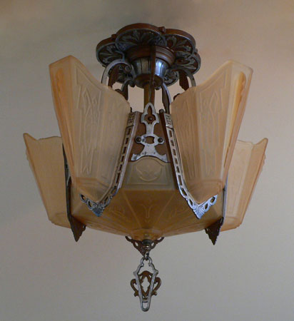 Chandelier C185*Not Available* This beautiful Art Deco chandelier by Markel has five, delicate, light amber glass slip shades embossed with geometric floral designs. The five shades suround a very large central shade at the base that reaches up on the sides of the fixture. All the glass is in very good condition. The metal fixture is aluminum with the original patina, in good condition. H: 19" (flush mount) |