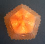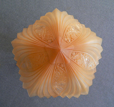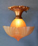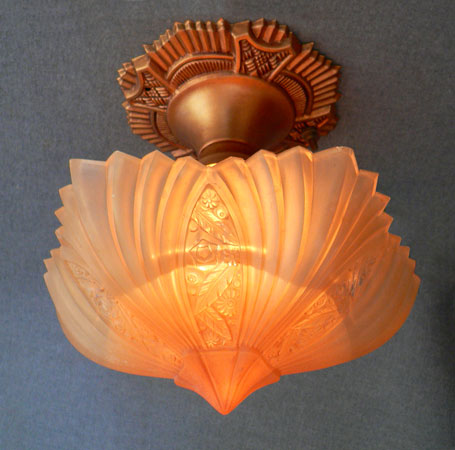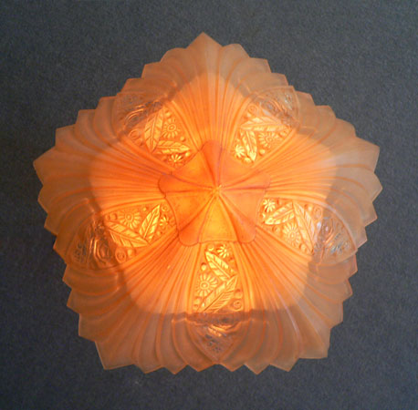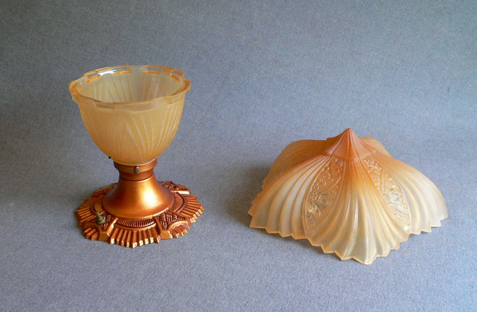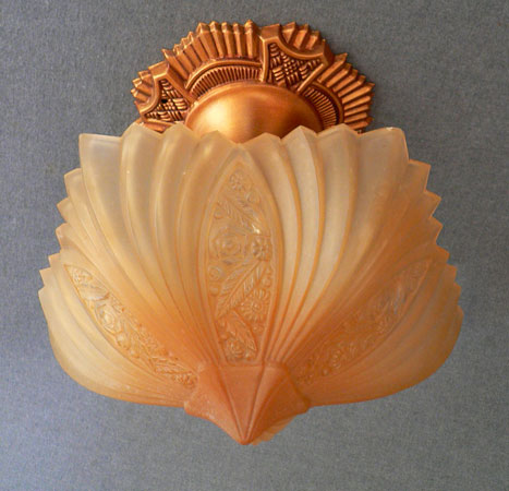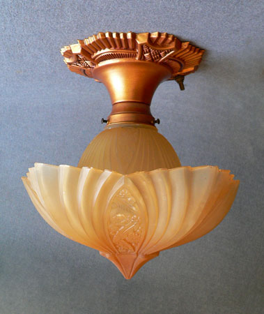 Chandelier C188*Not Available* This is an extremely rare Art Deco piece by Lightolier. The two part shade was made by Consolidated Glass. The large frosted Amber bottom shade is pentagonal in shape, and has beautifully sculpted fluting with panels of classic flower forms. The smaller glass bell is held in the metal fixture, which is finely designed and crafted. H: 11" (flush mount) |