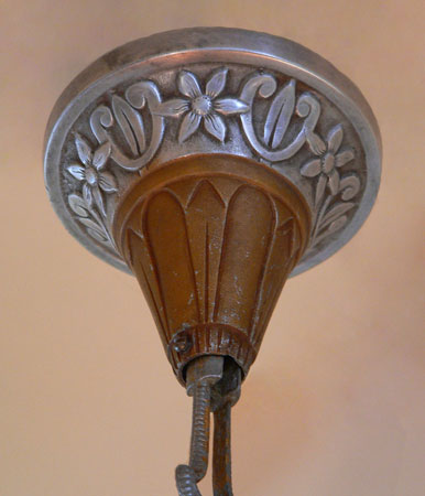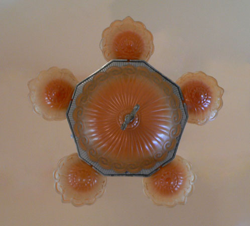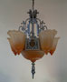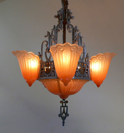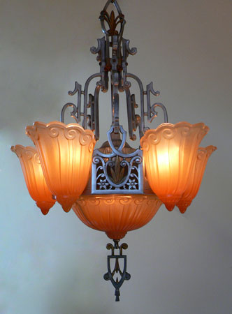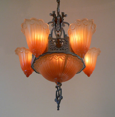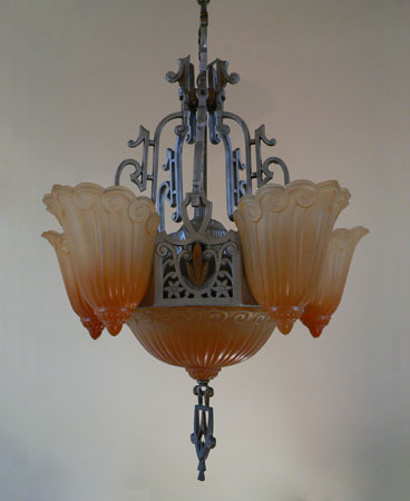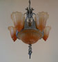Chandelier C19*Not Available* This is a large Art Deco chandelier by the Lincoln Co. The five "fleur de lis" slip shades are orange, darker on the bottom. The large central shade at the base matches the shades. It gives a wonderful glow when lit up. The metal is aluminum with excellent original patina. H: 34"(adjustable chain) |