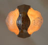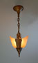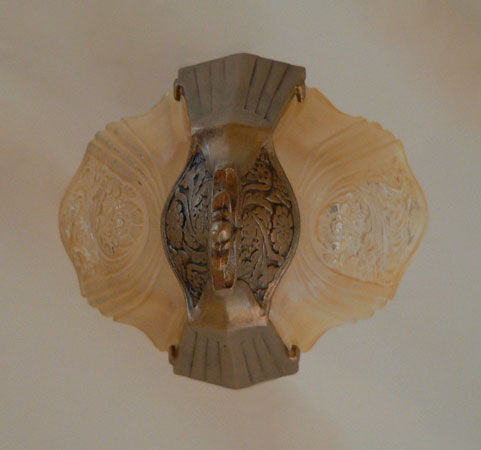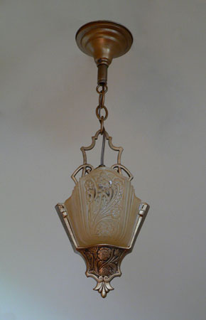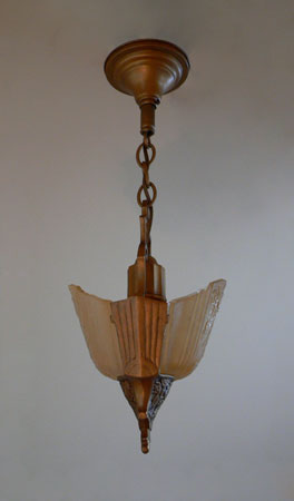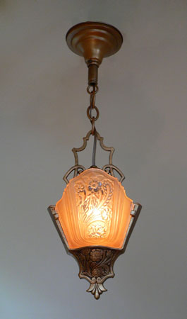 Chandelier C190This Art Deco pendant chandelier was made by Markel. The two slip shades are frosted amber with clear glass accents of the floral decorations. The metal fixture is bronze colored and embelished with floral designs that match. See matching sconces (S-139) and chandelier (C-17) H: 21" (adjustable chain) |