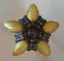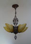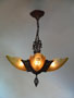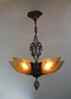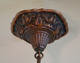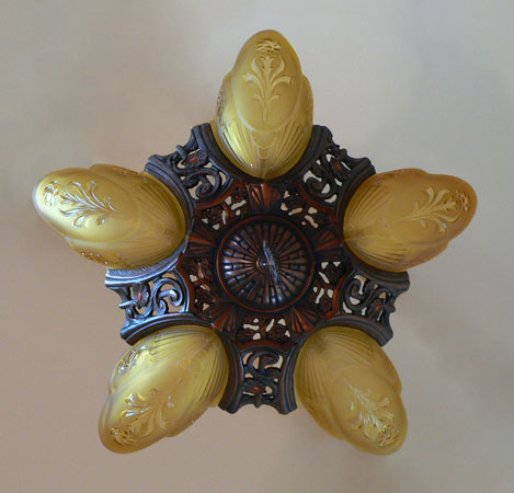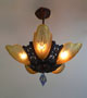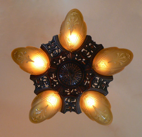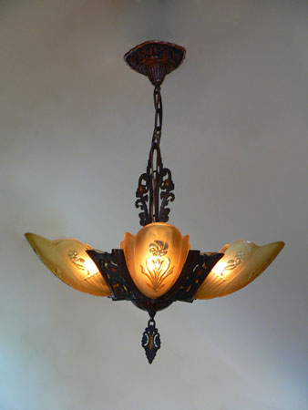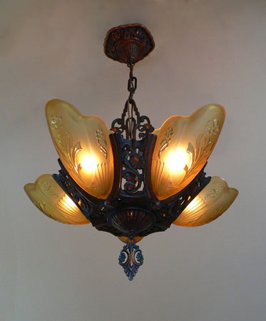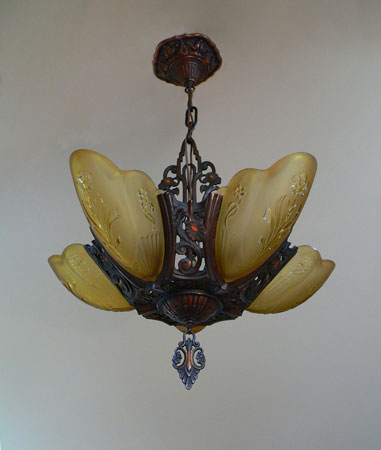Chandelier C192*Not Available* This is a beautiful Art Deco chandelier, made by the Markel Company. The five, amber slip shades have raised floral motifs that echo the designs throughout the metal work including the canopy, sinuous harp and finial. The polychrome fixture is bronze colored with red accents. Both the glass and original patina are in perfect condition. H: 28" (adjustable chain) |