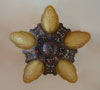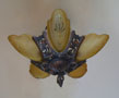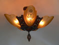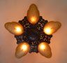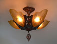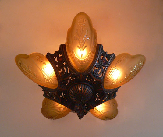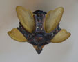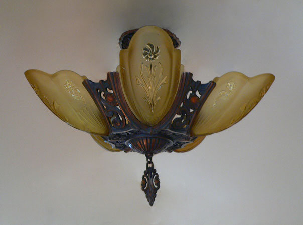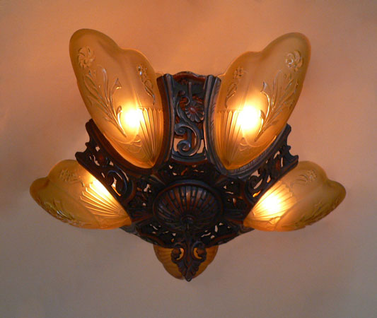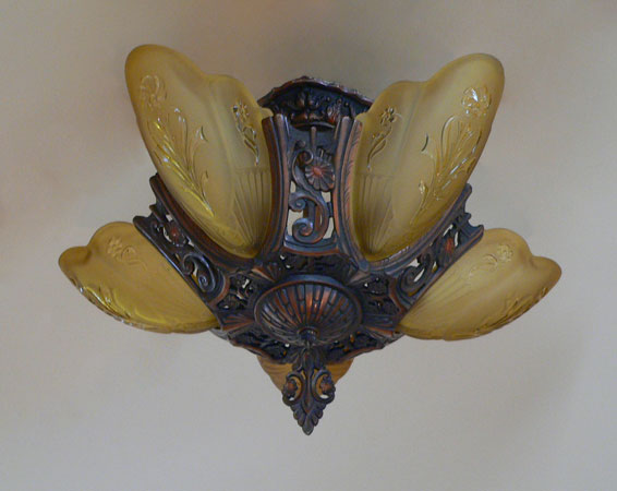 Chandelier C193*Not Available* This beautiful Art Deco chandelier, made by the Markel Company, gives off a warm amber glow when lit. The five, amber slip shades have raised floral motifs that echo the designs throughout the metal work. The polychrome fixture is bronze colored with red accents. Both the glass and original patina are in perfect condition. H: 15" (flush mount) |