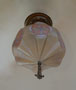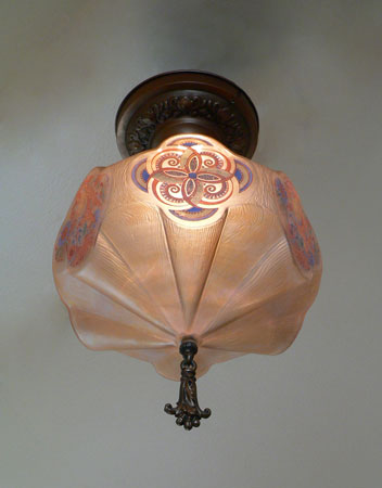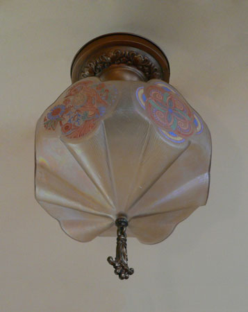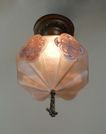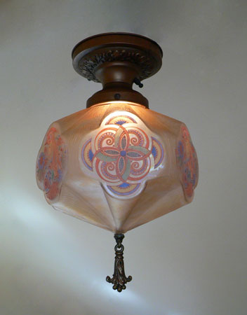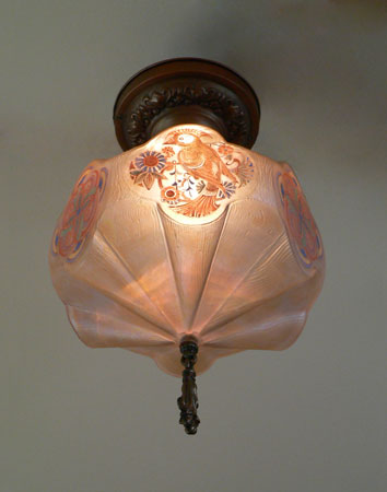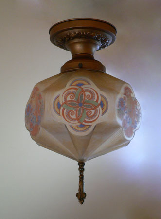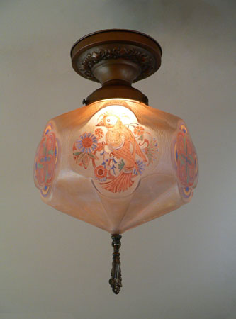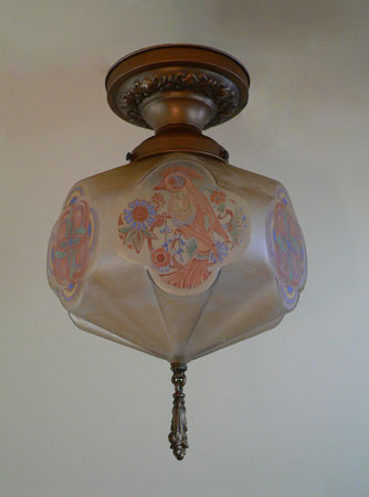 Chandelier C197*Not Available* This is a rare, hexagonal, moulded glass chandelier from the Art Deco period, made by Lightolier. Beautifully stylized painted birds, alternating with detailed designs, adorn the sides. The glass globe is in wonderful condition. It is held in a bronze colored fixture. The hanging finali is also bronze colored. H: 17" (flush mount) |