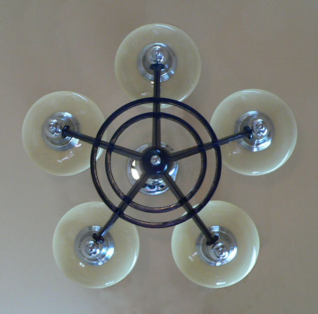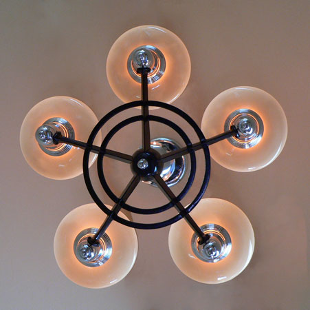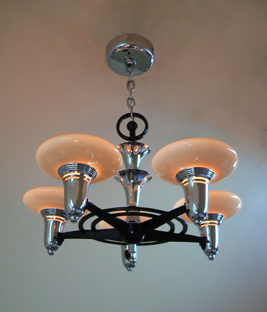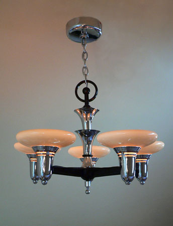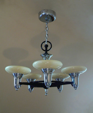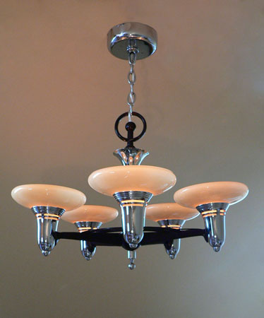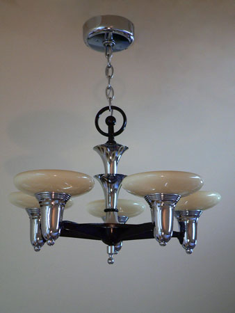 Chandelier C198This classic Art Deco chandelier by Lightolier has five beautiful saucer shades held in the sleek, chrome fixture. This futuristic design is from the 1930's. The glass shades are in perfect condition. The chrome/deep maroon fixture is in excellent shape. The companion 3-light fixture and matching sconces are also available. H: " |
