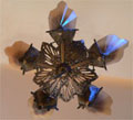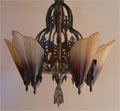 Chandelier C2This Art Deco chandelier is one of the exqusite and rare Soleure Series made by the Midwest Manufacturing Company of Kansas in the 1920's. The 5 "V" shaped brown tip slip shades are held by the extremely ornate bronze metal work. The original patina is in perfect condition. H: 32" (adjustable chain) |