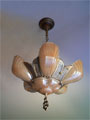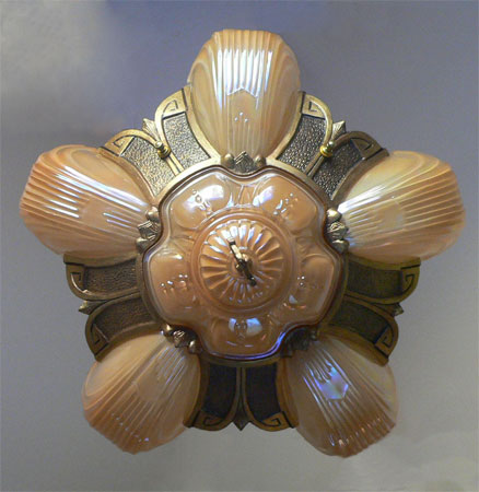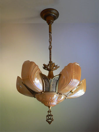 Chandelier C20*Not Available* This Art Deco chandelier by Markel has five opalescent, dark cream colored, "chevron" slip shades with a matching central shade at the base. The metal is aluminum with a refurbished, bronze colored patina. H: 27" (adjustable chain) |