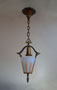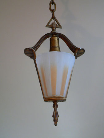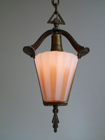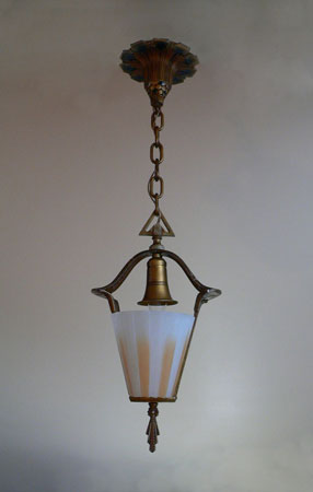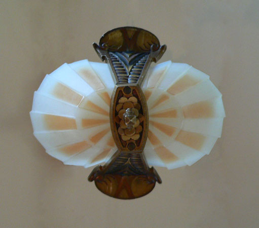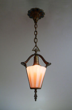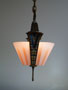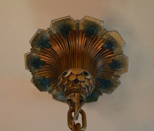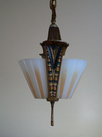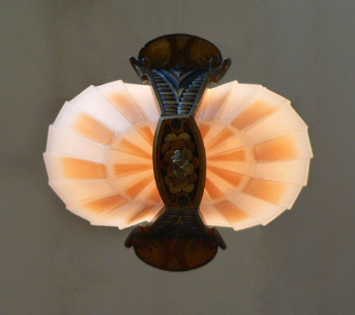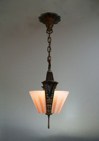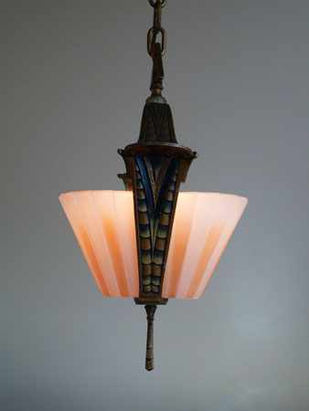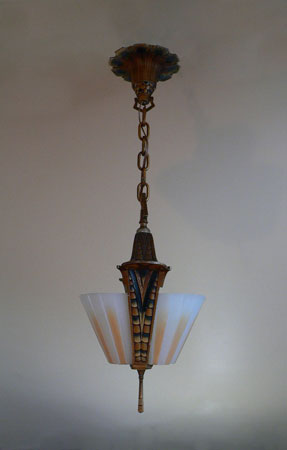 Chandelier C202This beautiful Art Deco Chandelier was made by the Beardslee Williamson Company of Chicago in the 1920's. The two, frosted glass, slip shades are sculpted and tinted with deep orange accents. The polychrome patina on the metal has copper, black and gold accents that off set the scalloped design. Both the glass and patina are in very good condition. H: 29" (adjustable chain) |
