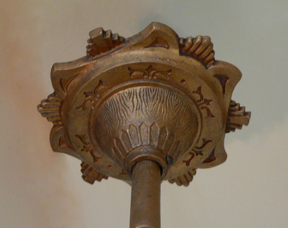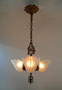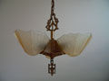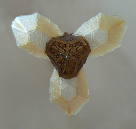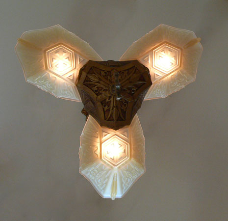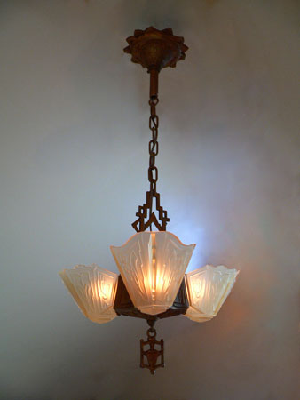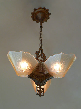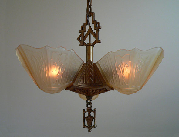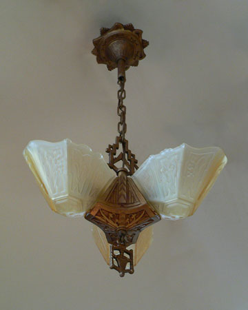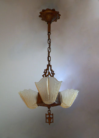 Chandelier C205This beautiful Art Deco chandelier by the Markel Co. has three amber glass slip shades. The glass has geometric designs that compliment the cast iron metal work. The gold colored patina is original and in perfect condition. H: 28" (adjustable chain) |