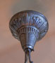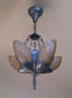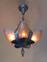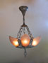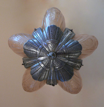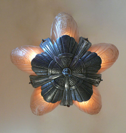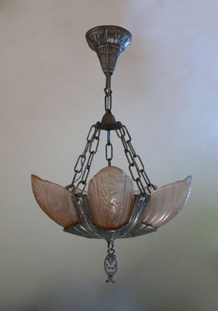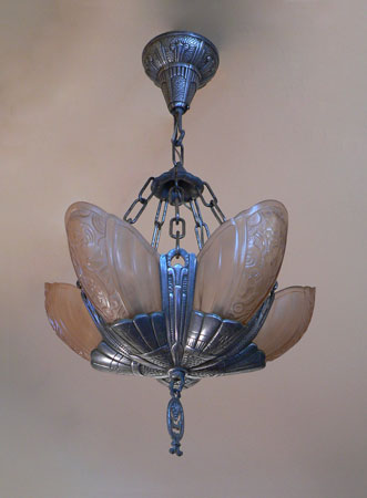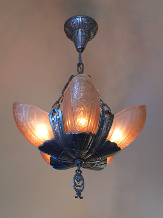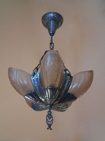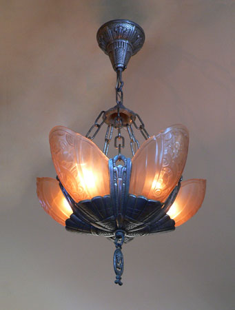 This Art Deco chandelier, by the Lincoln Company, has five light amber glass slip shades with floral designs. The metal is aluminum and the patina is in very good condition.