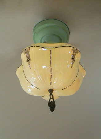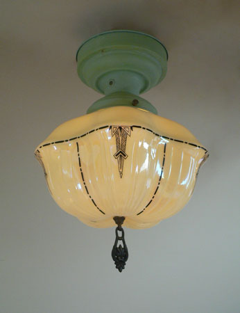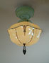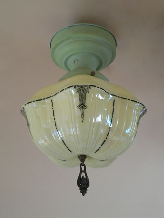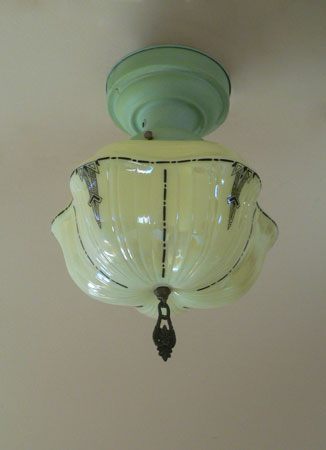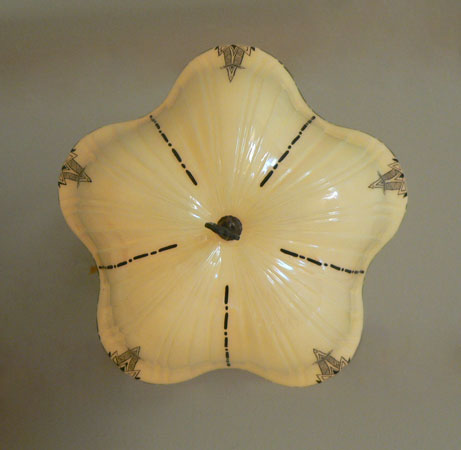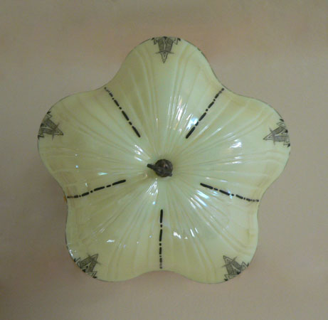 Chandelier C212This is an Art Deco chandelier with glass made by Gill. The beautifully shaped, five lobed, opalescent glass shade has a slight green tinge and stenciled geometric designs in black. The metal fixture has a pastel green finish. (shown in last pictures) H: 12" (flush mount) |