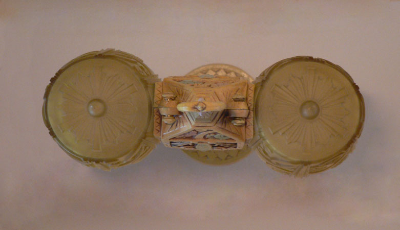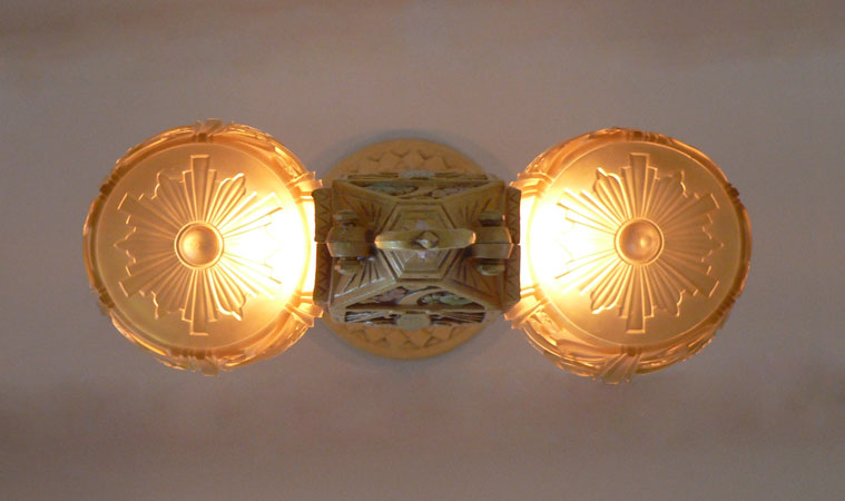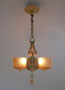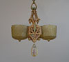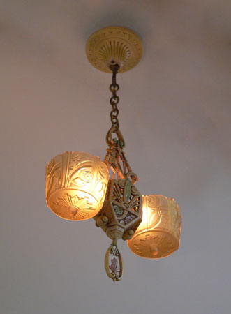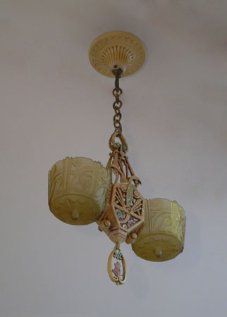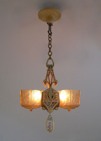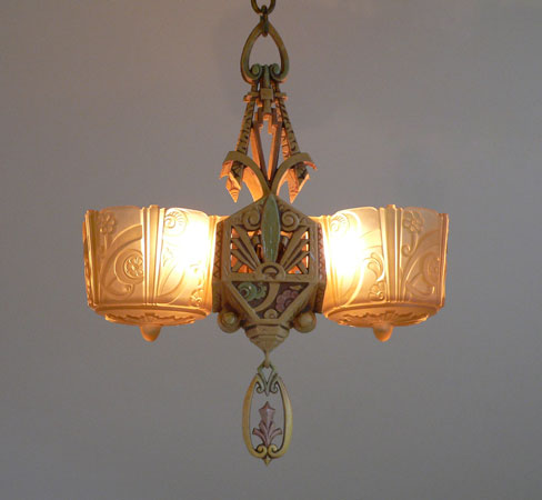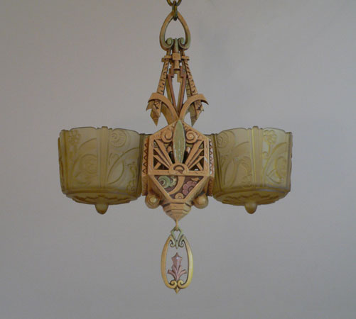 Chandelier C222This beautiful example of American Art Deco was made by Lincoln. The two amber glass slip shades are in excellent condition with deeply sculpted floral designs. The poly chrome aluminum fixture has floral designs and fanciful shapes. The original patina is cream colored with accents in light green, and pink. H: 26" (adjustible chain) |