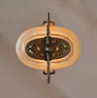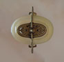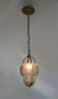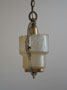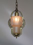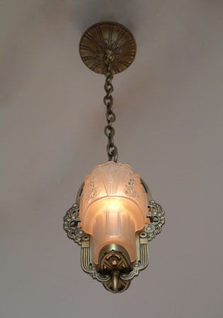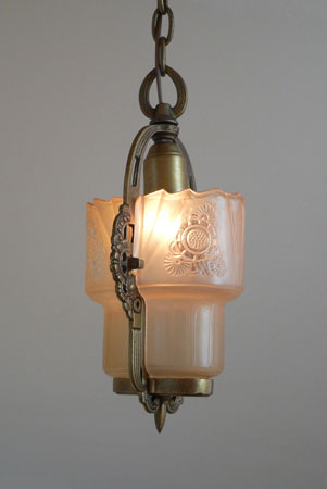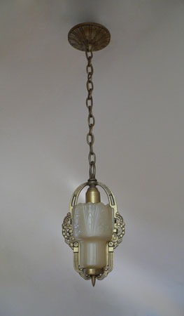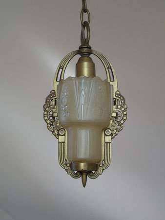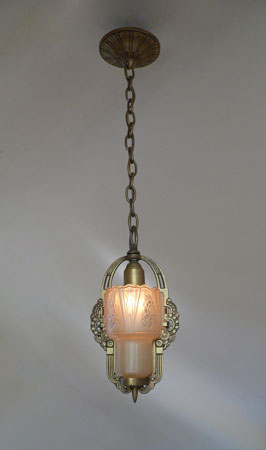Chandelier C224*Not Available* This beautiful pendant chandelier is an Art Deco design by the Lightolier Company. It has two beautifully sculpted, amber colored slip shades with tansparent floral designs. The heavy metal fixture has gracefully curved, decorative designs that compliment the glass. The patina has been refurbished to its original dark gold color. H: 29" (adjustable chain) |