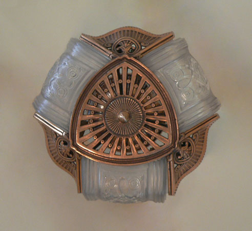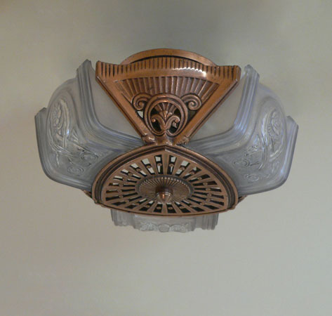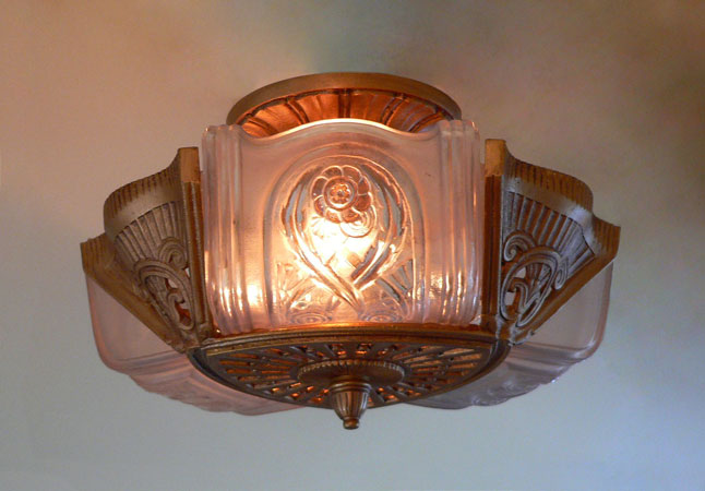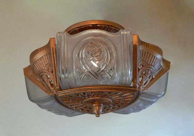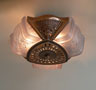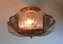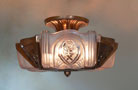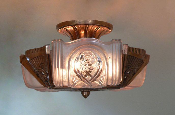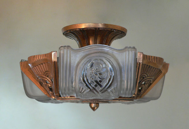 Chandelier C227*Not Available* This Art Deco flush mount chandelier was made by Lightolier. The three embossed slip shades have a warm glow when lit. The metal has its original deep golden colored patina. Both the glass and the fixture are in excellent condition. It is re-wired and ready for installation. H: 9" (adjustable chain) |