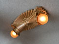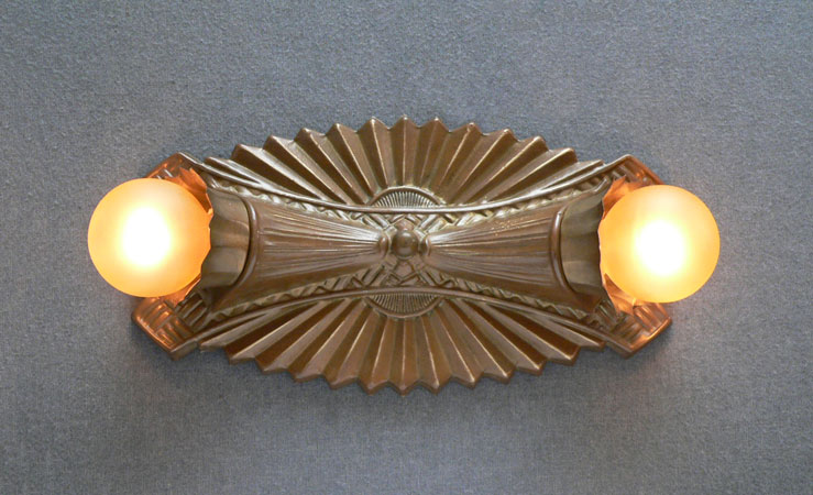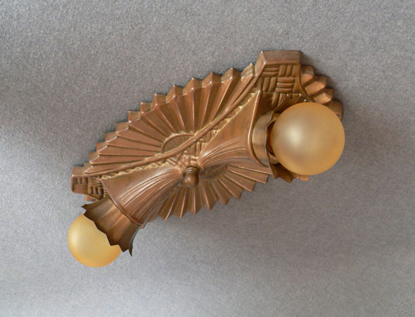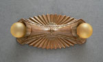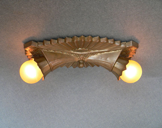 Chandelier C229*Not Available* This metallic Art Deco design, formed in a classic starburst, was made by the Gill Glass and Fixture Company. It still has the rare decorative "cuffs" that fit around the bases of the lightbulbs. The patina is a golden bronze color in very good condition. (please note: the bulbs are not included) Length: 12" (flush mount) |