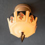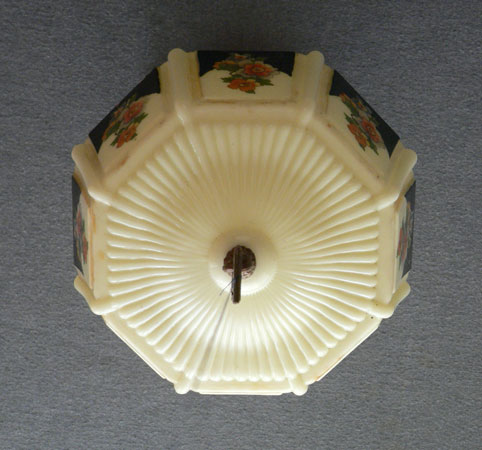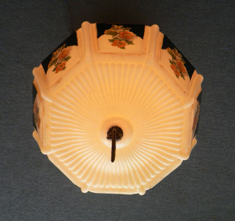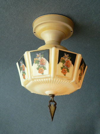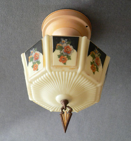 Chandelier C232*Not Available* This beautiful Art Deco flush mount Chandelier was made by Gill Glass in the 1920's. The octagonal glass shade is cream colored with a colorful floral pattern with some black background. The metal fixture is painted with a cream color. Both the glass shade and fixture are in good condition. Length: 13" (flush mount) |
